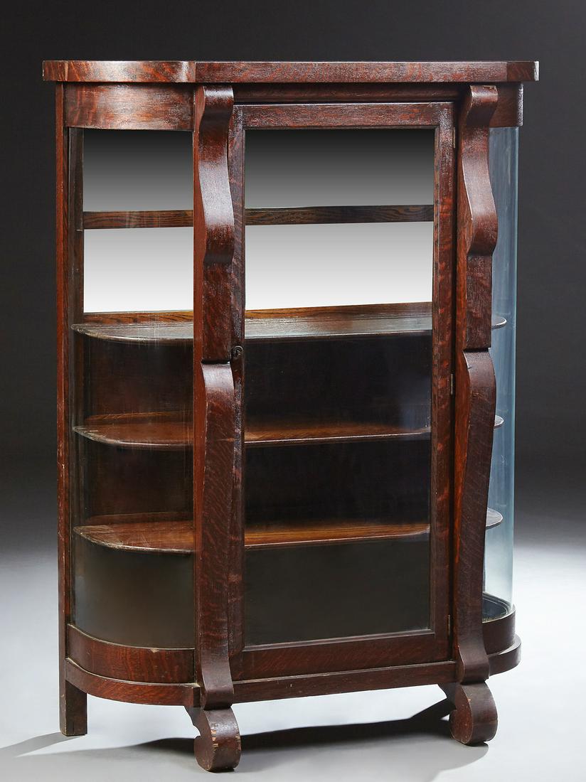 Antique Tiger Oak Rounded Glass Front Curio Cabinet In Good Cond